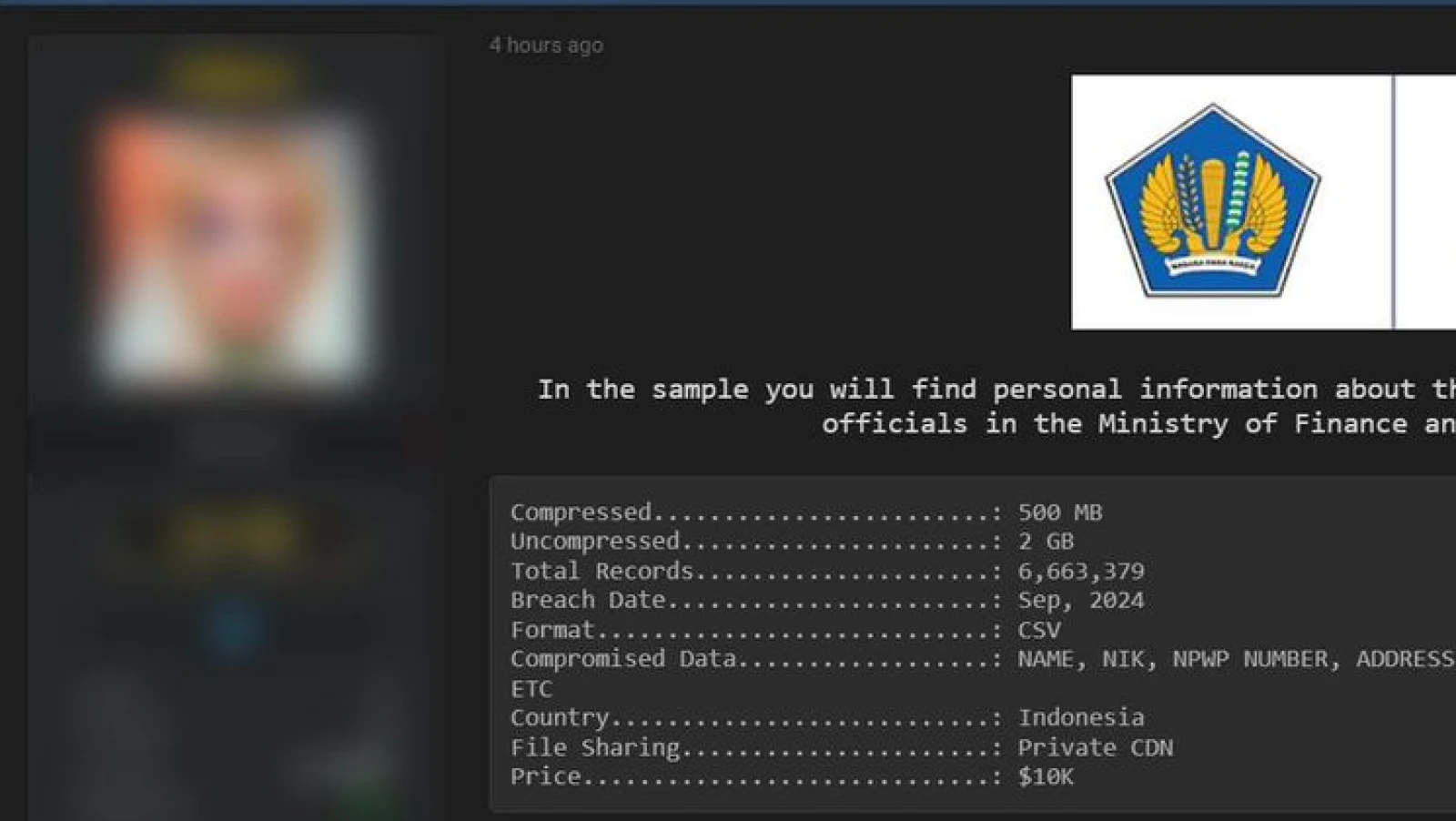 Terdapat kebocoran berupa data Nomor Identitas Kependudukan (NIK), NPWP, alamat, nomor telepon, alamat email, dan lain sebagainya.Pendiri Ethical Hacker Indonesia Teguh Aprianto melalui akun X miliknya menyampaikan, “Sebanyak 6 juta data NPWP diperjualbelikan dengan harga sekitar 150 juta rupiah,” tulisnya pada Rabu, 18 September 2024. Data-data yang bocor tersebut di dalamnya diduga terdapat milik Presiden Jokowi, Menteri Keuangan Sri Mulyani Indrawati, hingga Menteri Perdagangan Zulkifli Hasan. Dijual Seharga Rp 152 juta.